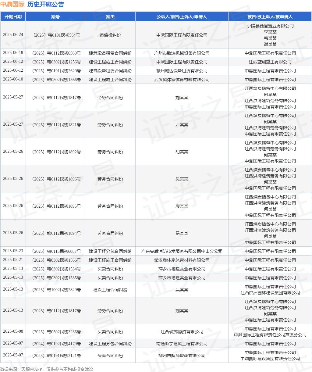 案号:(2025)赣1002民初2829号审理法院:抚州市临川区人民法院案由:建设工程合同纠纷当事人信息: 原告/上诉人:吴某某 被告/被上诉人:中鼎国际工程有限责任公司、江西洪洲园林建设集团有限公司开庭日期:2025年5月13日根据统计,近一年内以中鼎国际工程有限责任公司为当事人的历史开庭公告有103则,其中案由为“劳务合同纠纷”的公告以23则居首,其次为“买卖合同纠纷”有21则,“建设工程施工合同纠纷”有17则。历史开庭公告(前20条)如下: